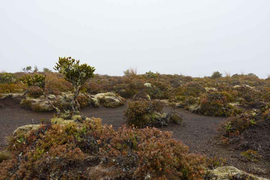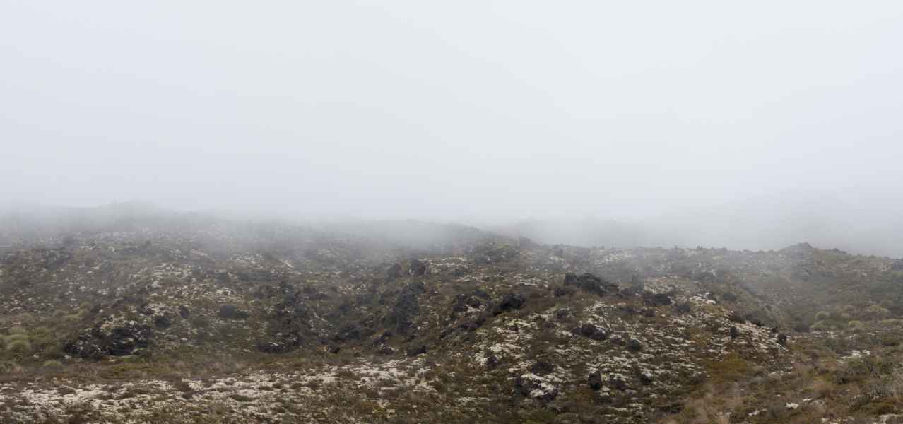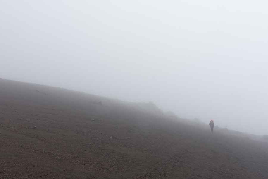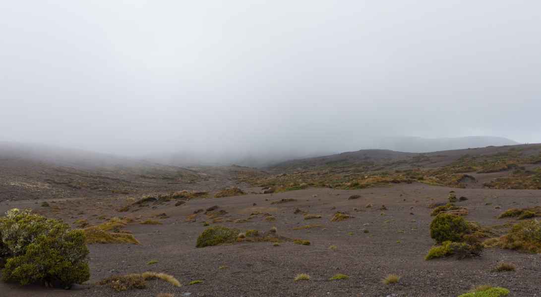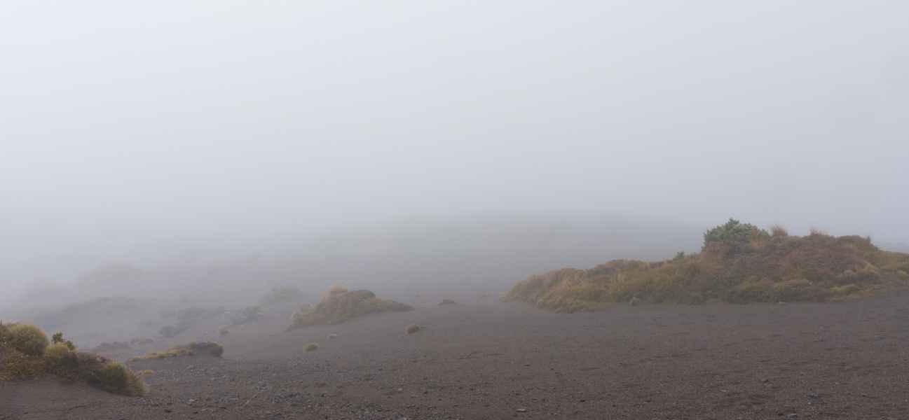 Le temps était gris, on ne pouvai pas voir les sommets des volcans qui nous entouraient. Mais il faut toujours voir le positif, ça nous a évité de cramer en plein cagnard !